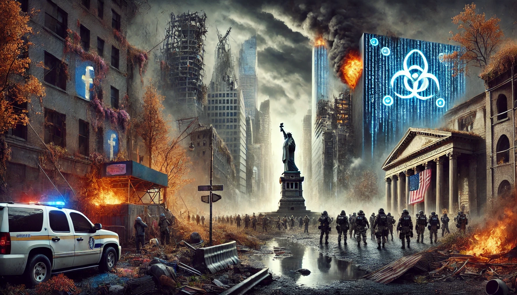 A conceptual illustration of modern Western military in decline. The scene includes rusting and abandoned military vehicles such as tanks and fighter